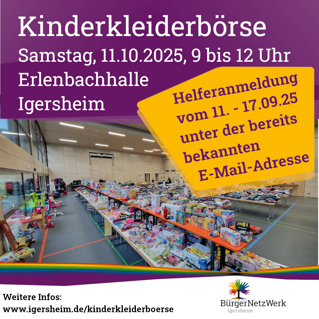 Ab Donnerstag, 11. September 2025, startet die Helferanmeldung. Hier dürfen sich bis spätestens 17. September 2025 alle bisherigen Helfer, die wieder bei der Kinderkleiderbörse unterstützen möchten, unter der bereits bekannten E-Mail-Adresse melden.