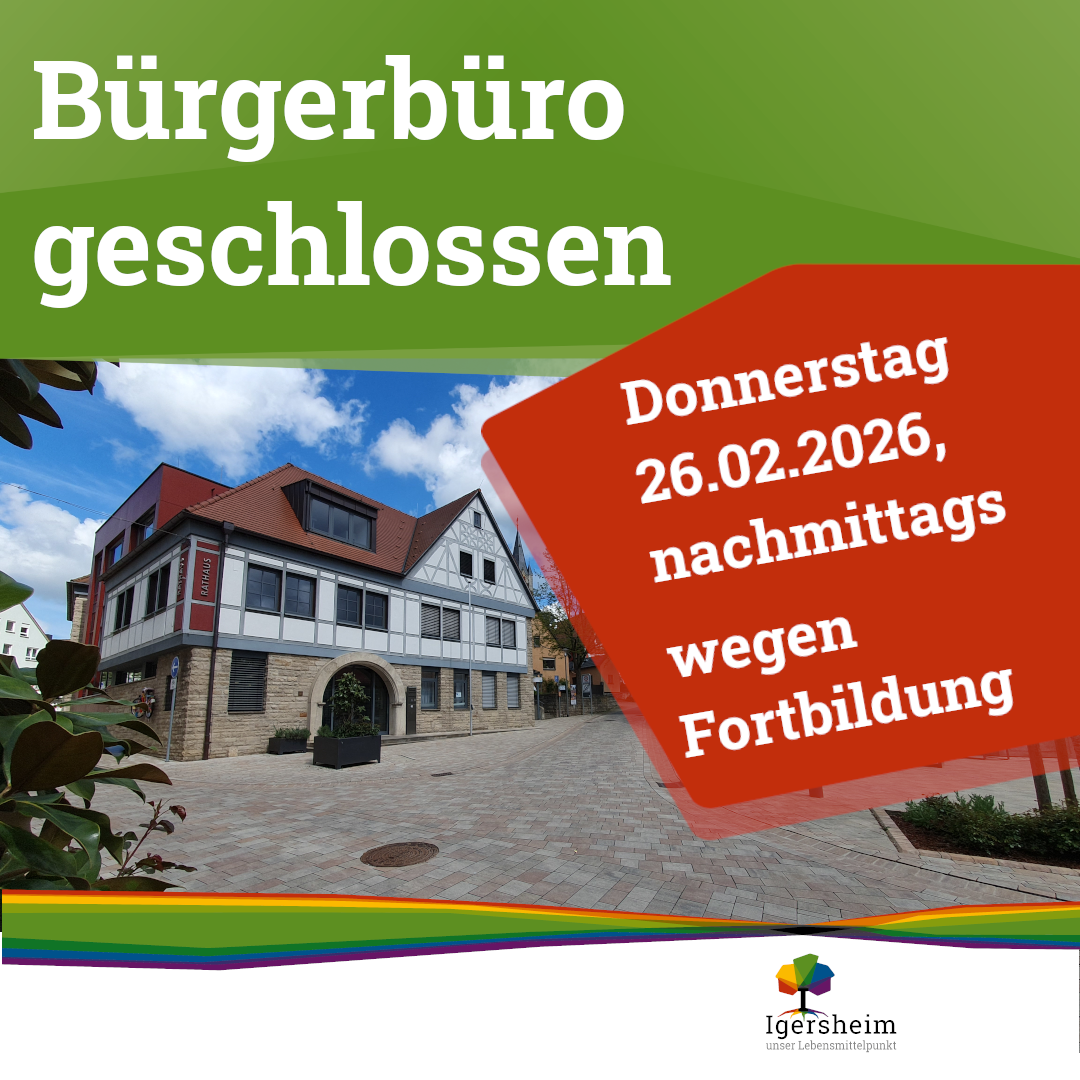 Am Donnerstag, den 26.02.26 bleiben Bürgerbüro und Standesamt am Nachmittag wegen einer Schulung geschlossen.