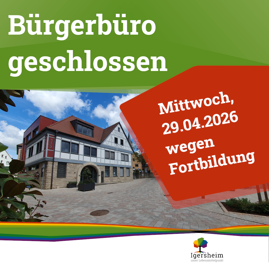 Auf Grund einer Fortbildung bleiben Bürgerbüro und Standesamt am Mittwoch, den 29.04.2026 geschlossen.