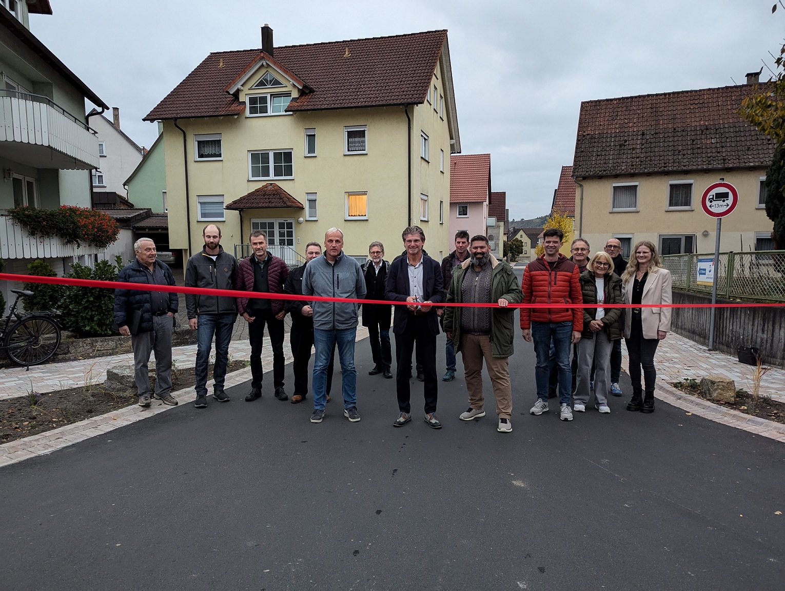 Ein Schlückchen in Ehren kann niemand verwehren: Direkt vor der Sitzung des Gemeinderates erfolgte die offizielle Freigabe der modernisierten Burgstraße – ein Grund zum Anstoßen. Bevor Bürgermeister Frank Menikheim das Band durchschnitt, würdigte er das gute Miteinander aller an der Maßnahme Beteiligten, darunter die Firma Benninger Bau sowie das Ingenieurbüro Dreikant mit Diplom-Ingenieur Andre Metzger an der Spitze. Der Rathaus-Chef nannte die Maßnahme „bedeutend und gelungen“. In einer vorbildlichen konzertierten Aktion habe man es geschafft, nicht nur zeitlich alles hinzubekommen, sondern auch innerhalb des ursprünglichen Kostenrahmens von 950 000 Euro zu bleiben, wie auch Andre Metzger bestätigte. Nachdem nun auch die Pflanzbeete bestückt und sämtliche kleinen Restarbeiten beendet worden seien, sei die Maßnahme abgeschlossen. In Sachen Ortssanierung sei nun ein weiteres Puzzleteil hinzugefügt worden.