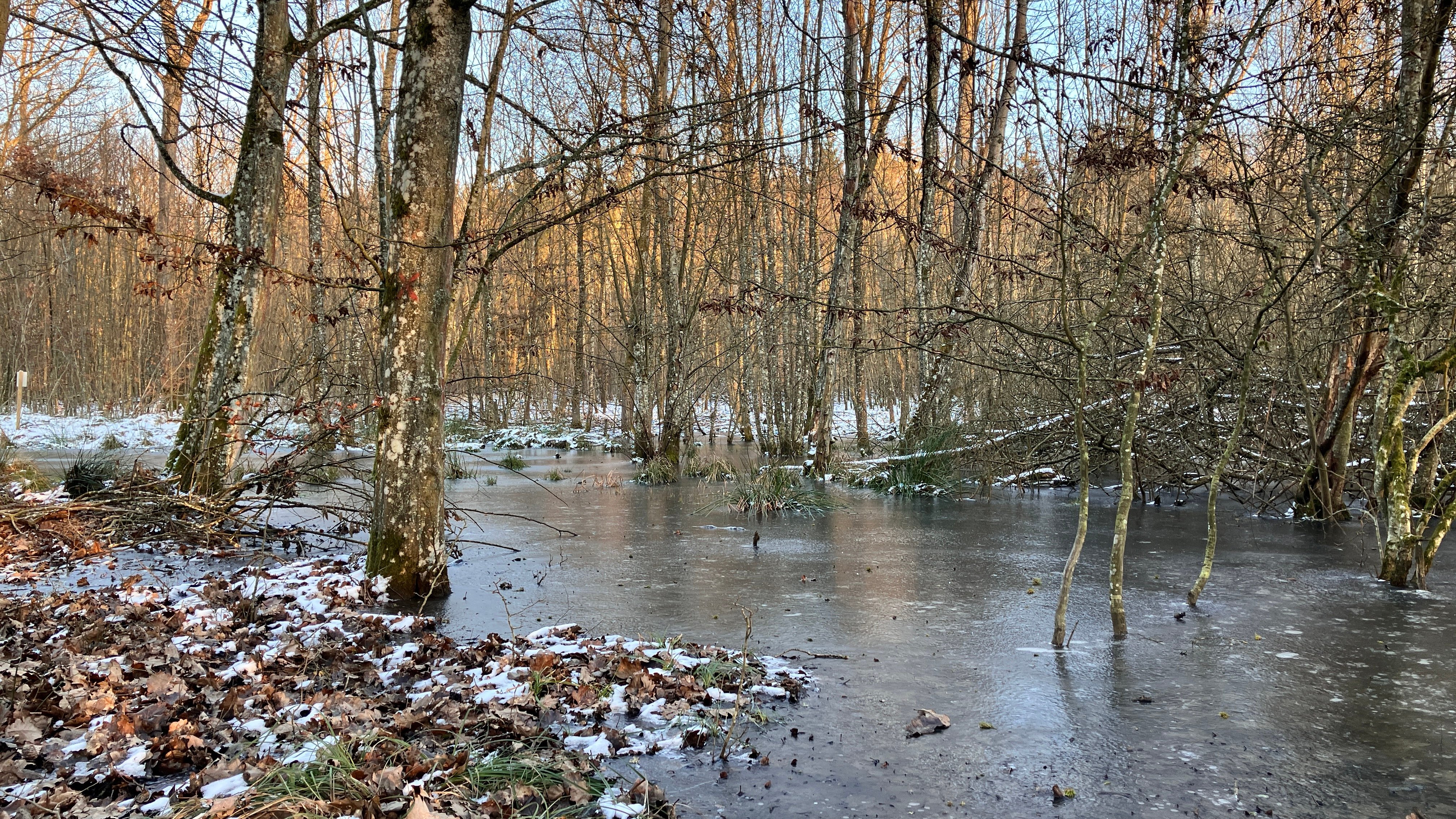 Die Winterniederschläge haben das Becken bis zum Rand gefüllt, sodass auch die am Rand, normalerweise im trockenen stehenden Hainbuchen, nasse Füße bekommen haben