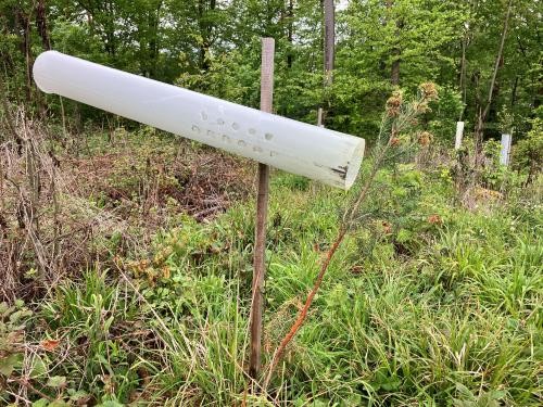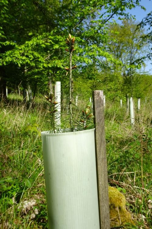 Junge Nadelholzbäumchen sind aufgrund ihres Harzgehaltes äussert beliebte Fegeobjekte für Rehböcke, in stärkeren Dimensionen auch beliebte Reibe - und Kratzbäume für Wildschweine. Aufgrund dessen werden die Setzlinge in sogenannte Wuchshüllen verpackt : Neben dem Verbiss- und Fegeschutz bieten diese Hüllen den Pflanzen bessere, kleinklimatische Verhältnisse, was vom Großteil der Pflanzen in deutlich stärkeres Wachstum umgesetzt wird. In absoluten Trockenjahren kann sich dieser Vorteil auch ins Gegenteil umkehren. Dann wird es nämlich zu heiß in den Hüllen und die Ausfallquote steigt rapide an.